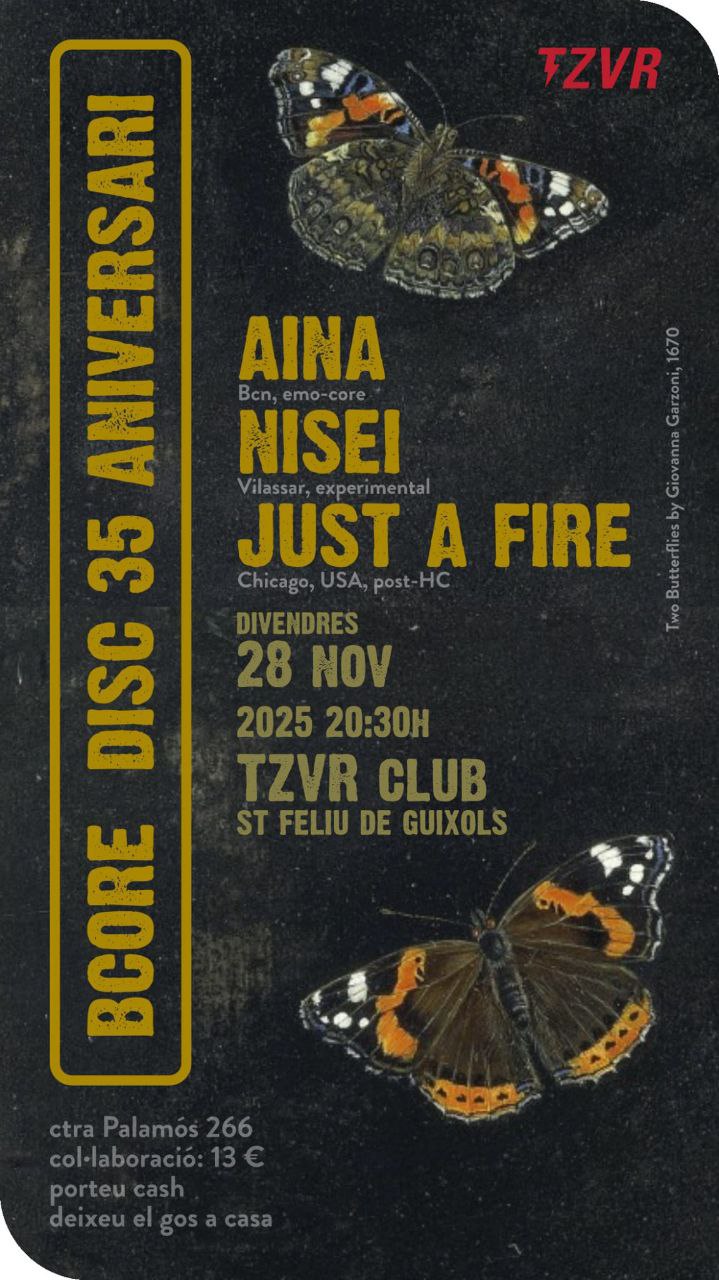 Celebrem el 35è aniversari del segell Bcore amb una festa única: 3 bandes que ja no estan en actiu tornen per a l’ocasió. D’una banda, AINA, probablement el grup més representatiu de tota una escena, el grup que va marcar el camí de tants altres grups, els viatgers incansables i els executors artesans d’un post-hardcore precís i emocional. En segon lloc, JUST A FIRE, mítica banda de Chicago amb membres de June of 44, Sweep The Leg Johnny Hoover o Abilene; ho van deixar l’any 2006 i tornen per a celebrar amb nosaltres. Finalment, NISEI, el primer grup de post-hardcore a cantar en català amb el seu genial “Continents”, tornaran a trepitjar un escenari anys després en pro de l’amistat que s’ha trenat al voltant d’un segell com Bcore.